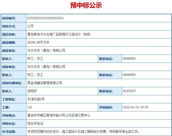 青島麥島污水處理廠品質(zhì)提升工程設(shè)計(jì)預(yù)中標(biāo)公示